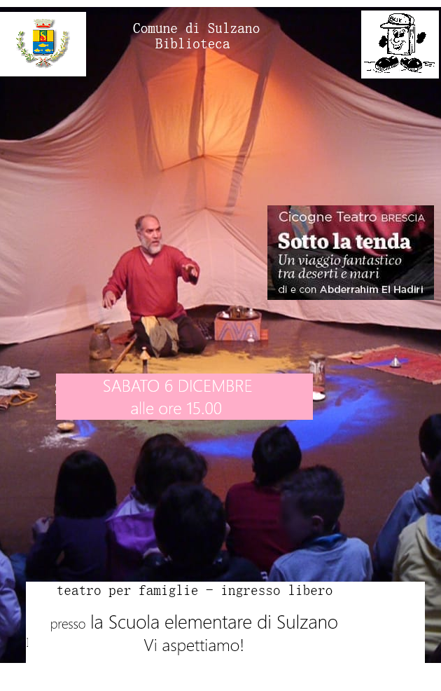 Sabato 6 Dicembre, alle ore 15.00, presso la Scuola Primaria di Sulzano si terrà uno spettacolo teatrale per famiglie “Sotto la tenda – un viaggio fantastico tra deserti e mari” in collaborazione con il Cicogne Teatro di Brescia.